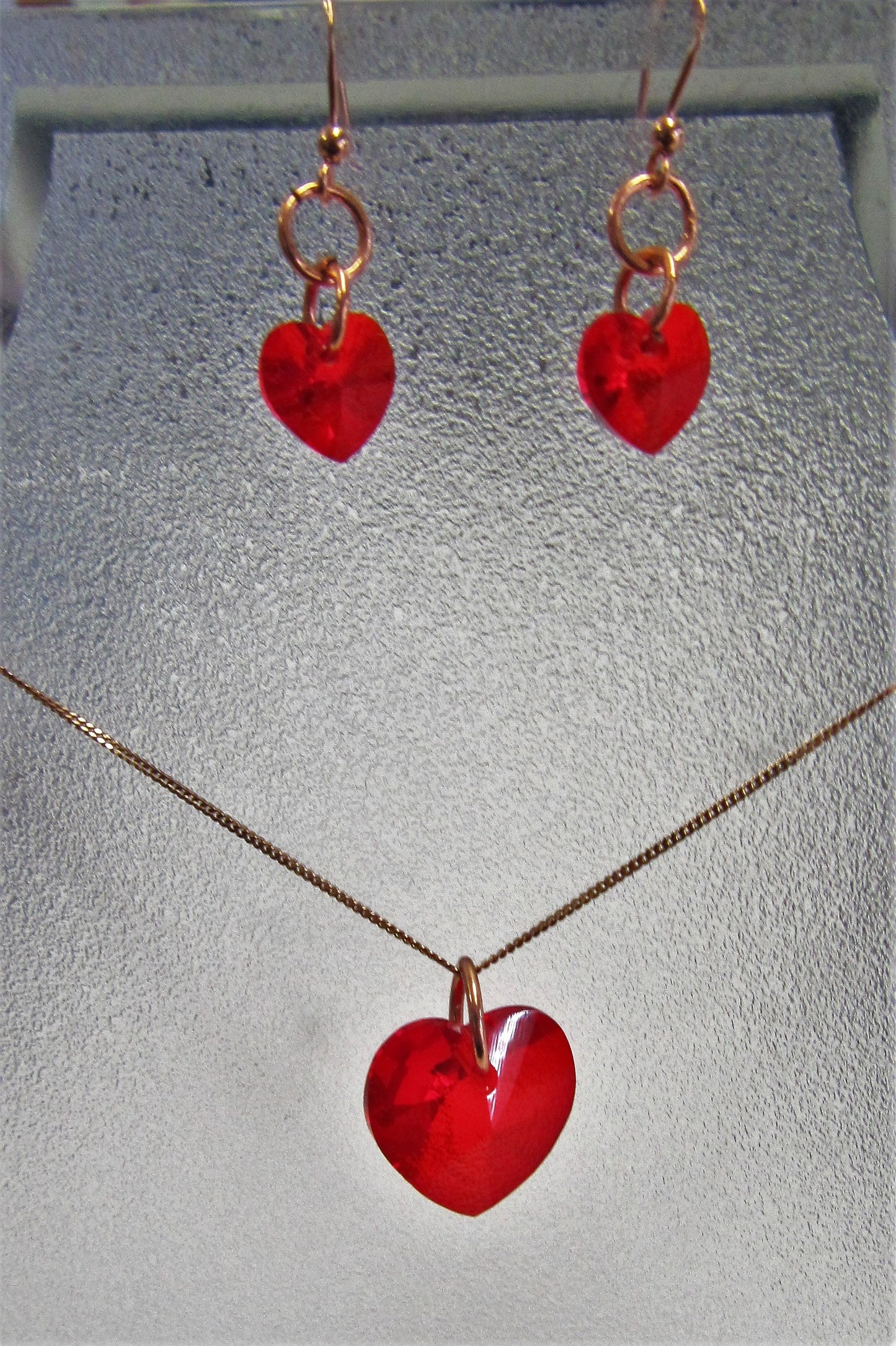 Purchase your Handcrafted swarovski Crystal red hearts on rose gold plated necklace and earring set Now !!
