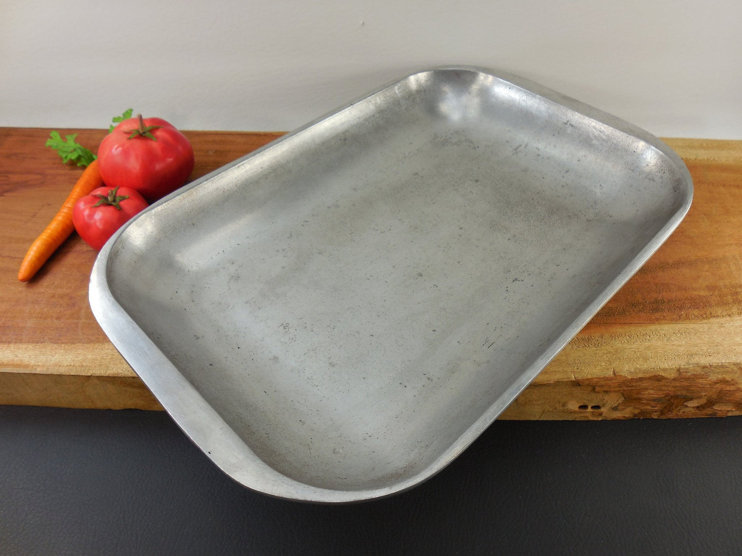 Good used vintage condition... we have cleaned loose cooked residues - some carbon specks remain... sits flat... no dents or form damage... nice heavier weight open roaster - hard to find.