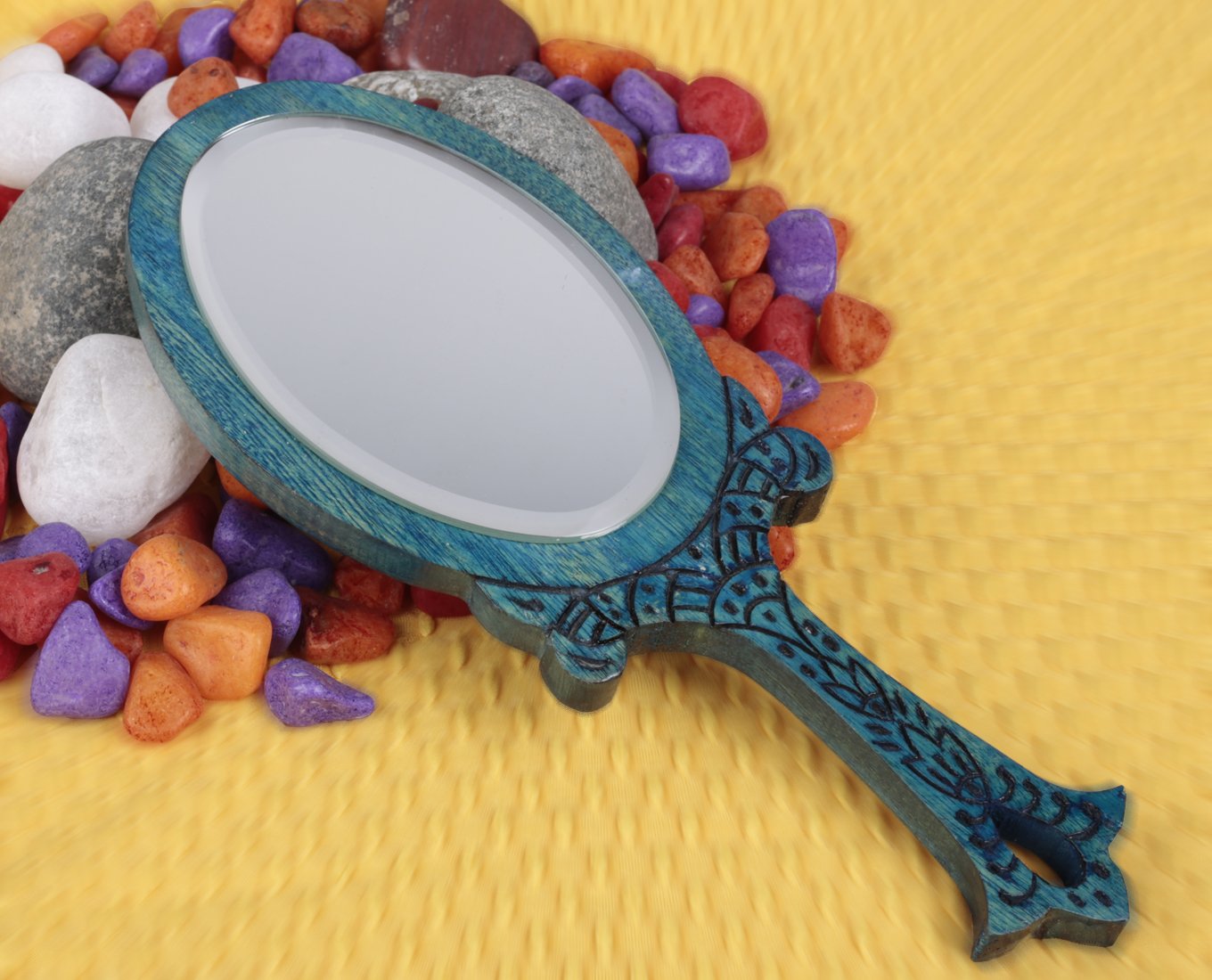 Hand Crafted By National Award Winner Artist Abshar Husain.Hand Crafted By National Award Winner Artist Abshar Husain.This elegant wooden carved oval shaped handheld mirror from "Royal Collection" is an antique addition to your dresser and also gives it an ethnic appeal. The distinctive blue colour of the mirror makes a style statement and brings a vibrant effect to your dressing table. This masterpiece is handcrafted in steam beach wood and decorated with distinctive engraving done on the body of the mirror. It will brighten up the walls and your mood like a decorative wall mirror and adds a grace & class to your home decor. It is best suitable for travelling and is easy to clean and lightweight as well. It is designed to keep in ladies purse.