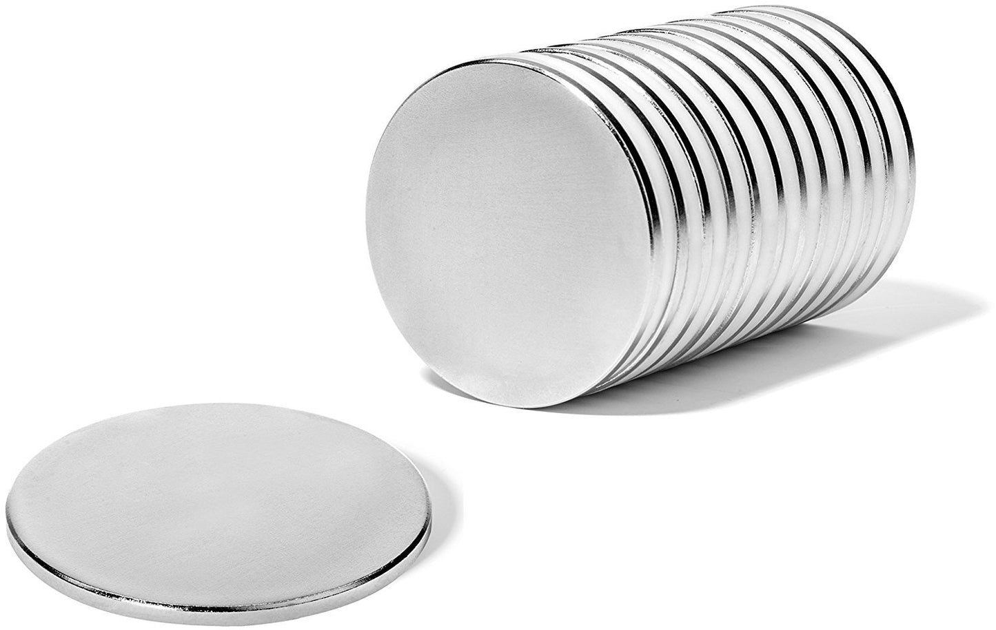 - These neodymium magnets disc are much stronger and more durable than most because our magnets are made of a stronger alloy and are triple coated with Ni-Cu-Ni (Nickel-Copper-Nickel) which makes the magnets even sturdier. Package contains 12 disk magnets 1.26" (32mm) in diameter and 1/16" (1.5mm) thick plus 12 highly demanded 3M double-sided adhesive stickers.